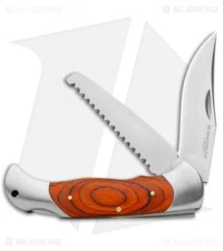The Boker Magnum Classic Hunter Slim pocket knife is useful for a wide array of cutting and sawing tasks. It features a satin-finished stainless steel clip point blade and a saw. Each lock opens with a lockback system. The handle features stained wood scales, stainless steel liners, and brass rivet construction.