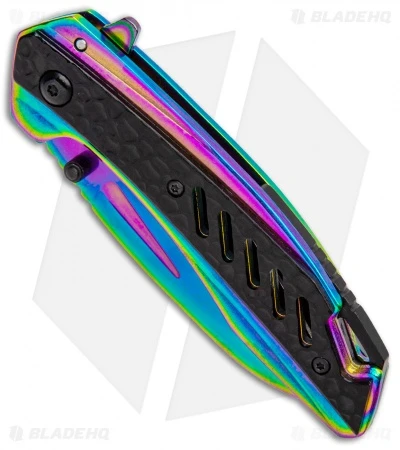 This Boker Magnum Rainbow Charcoal assisted-opening knife has a fun design that makes the perfect collection item. The blade is made from 440A stainless steel in a rainbow spectrum finish. It features a black scale, thumb stud, and back spacer. This knife has simple lines, but still makes a statement. This is great if you’re looking to add an awesome collection piece that will turn heads.