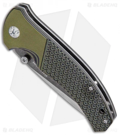 The Boker Magnum Three Dimensions is a beefy folding knife with OD Green and black layered G10 handle with aggressive texturing, a two tone stonewash/acid stonewash blade, and stonewashed hardware. The knife opens with the dual thumb studs, and has a secure tip-down pocket clip.